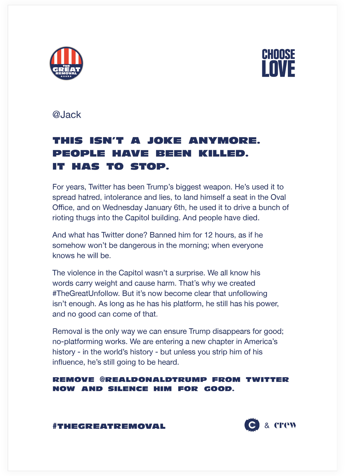 The final stage of our campaign: after Trump used Twitter to rally his supporters together to riot in the Capitol, we realised unfollowing him wasn’t enough. He’d never truly disappear unless he was completely de-platformed, so we evolved into #TheGreatRemoval: a campaign to have Trump permanently removed from Twitter, silencing him once and for all. We penned an open letter to Jack Dorsey the CEO of Twitter, and encouraged everyone to tweet him demanding immediate action.