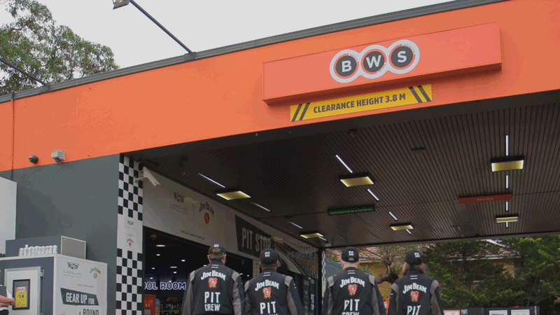 Just down the road, we kept the energy going with a BWS takeover. Fans could jump into the Pit Stop Challenge: line up, rev your trainers, and race against the clock to grab a Jim Beam and make it out in record time – for a shot at some seriously good merch.