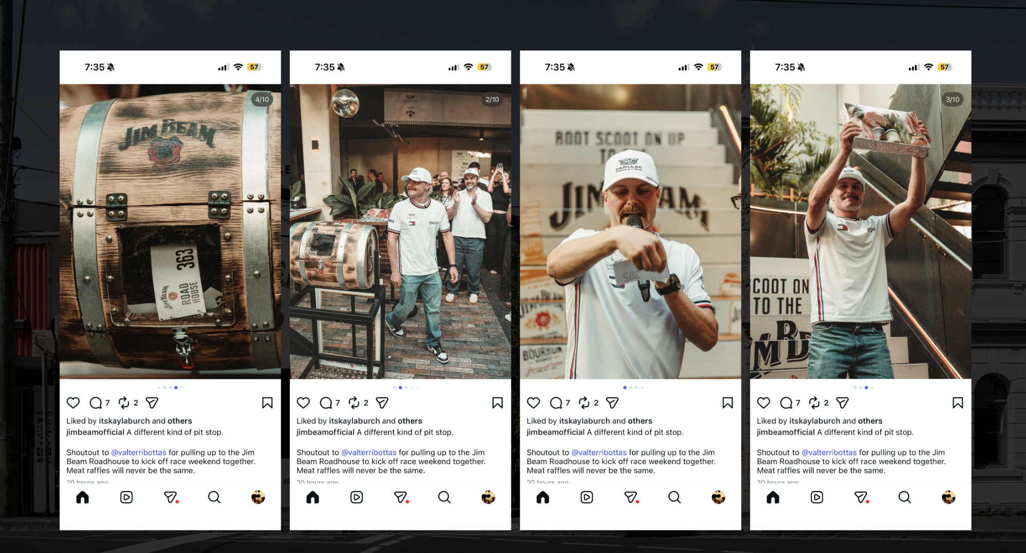 So we brought the Jim Beam Roadhouse to life at the Village Belle, taking over the entire venue and transforming it into a full-blown Kentucky bourbon bar. And to kick things off? A ‘Meat and Greet’ (definitely not a typo), where Bottas hosted a classic Aussie meat raffle for fans – about as local as it gets.